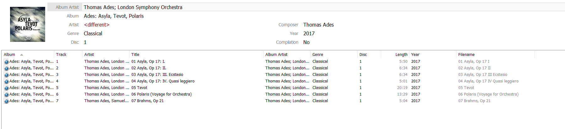 Note that the album artist in the metadata is listed as 'Ades' and yet the ID Tag for album artist shows 'Thomas Ades; London Symphony Orchestra'. Why would that be? Shouldn't the changed ID Tag equate to a change in the metadata? If not, how does one go about changing the metadata so that music is organized in a consistent manner?