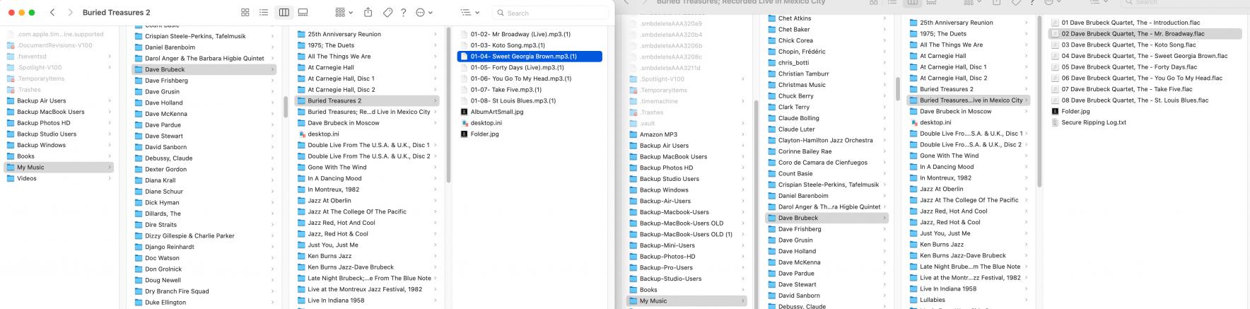 I cleared the databases in PerfTunes and re-ran de-dup, which found no duplicates. I know there are many dupes as FLAC and MP3 files. I am looking at one pair in Finder, both in the same sub-folder of my music library. One is the FLAC version and one is the MP3 version.