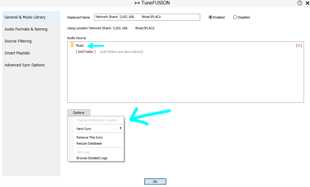 Bought TuneFUSION today and installed it (three times) on a recent Windows 10 machine. No matter what I try I cannot get it working; every time I add a New Sync from a local or network folder, it adds a Music folder. But the main thing is that the Edit | Change Destination Location option does not work. It is greyed out. No idea how to solve this