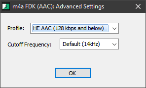 [number 1-5] tag. Correct version below. I also added the options for AAC HE and AAC HEv2 although you might want to test a bit before committing to those settings. It certainly seems to work with CBR IF you resample to 24khz, but without resampling to 24Khz you'll get a 96Khz output from standard 48KHz input, so either I'm missing some settings or the current build included isn't fully implemented. Same with Cutoff frequency (you wouldn't want to touch that anyway under most circumstance)