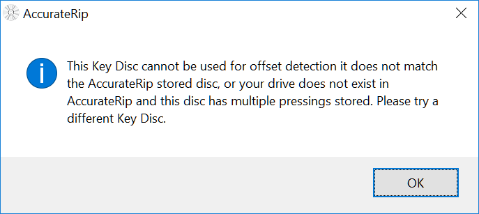 The message reads, "This Key Disc cannot be used for offset detection it does not match the AccurateRip stored disc, or your drive does not exist in AccurateRip and this disc has multiple pressings stored. Please try a different Key Disc."