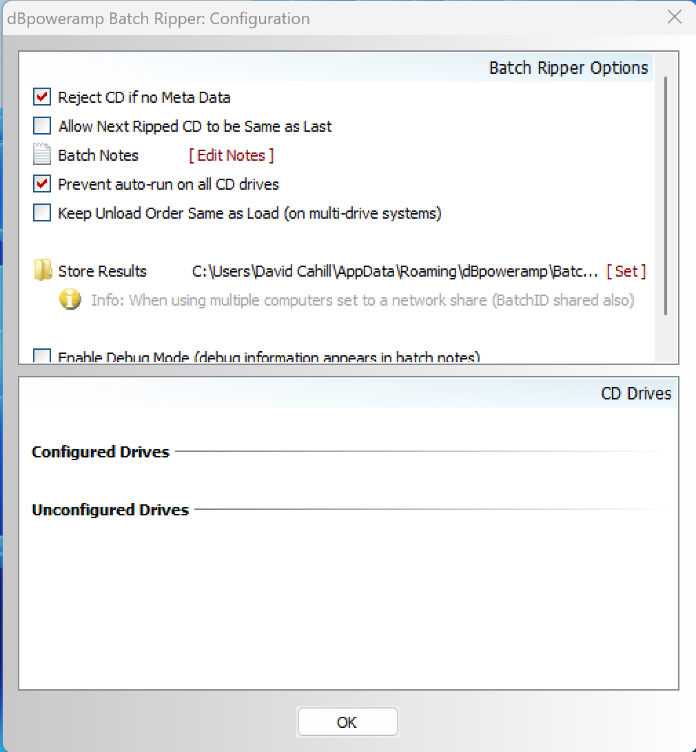 5. I can get as far as the Batch Ripper configuration page on one of my computers (Windows 11), and it says "No CD drives configured". When I hit "Configure", I get the Batch Ripper options box and nothing else (the Nimbie machine IS plugged in and on and the USB is connected to my computer).
