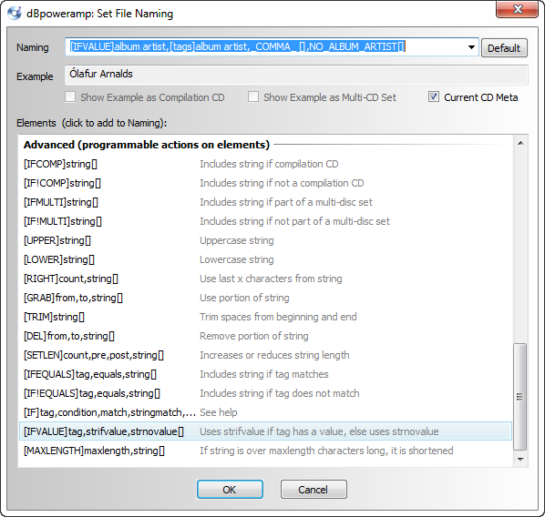 [IFVALUE]album artist,[tags]album artist,-[],[IFCOMP]Compilations[][IF!COMP][artist][][]\[album]\[IFMULTI][disc]-[][track] [title]