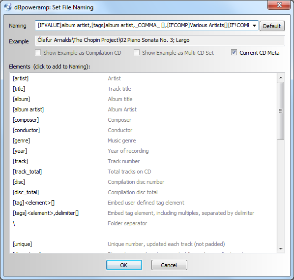 [IFVALUE]album artist,[album artist],[IFCOMP]Compilations[][IF!COMP][artist][][]\[album]\[IFMULTI][disc]-[][track] [title]