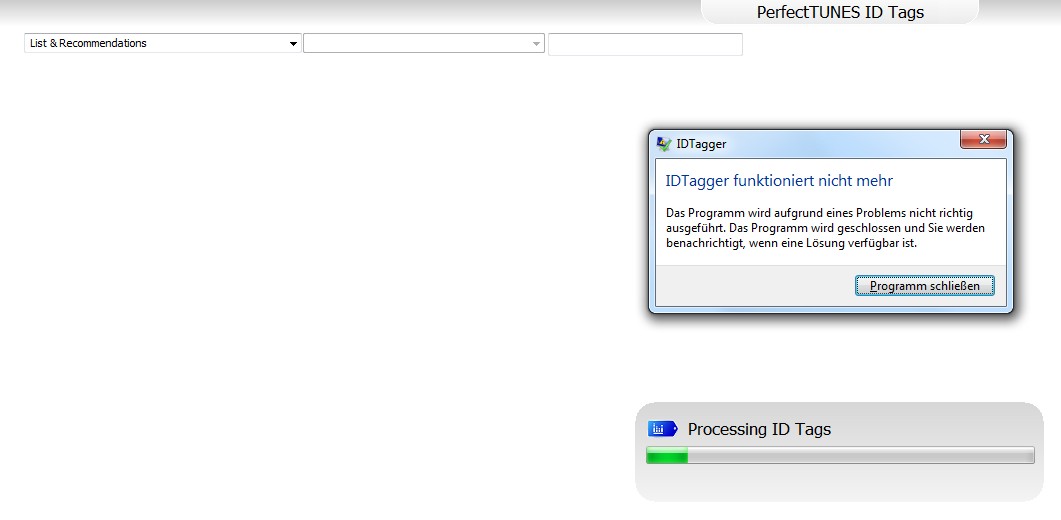 Forgot to mention that the amount of files did not change. I added two CD on Friday and it worked fine. Then I saw some inconsistencies with PerfectTunes, corrected them with MusicBee and next time PerfectTunes IDTagger threw this error...